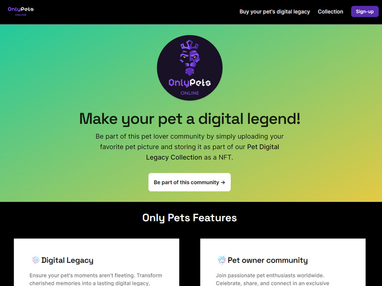 Turning your pets into digital legends, OnlyPets is a vibrant pet lovers' community leveraging blockchain technology for a seamless and enriched pet ownership experience